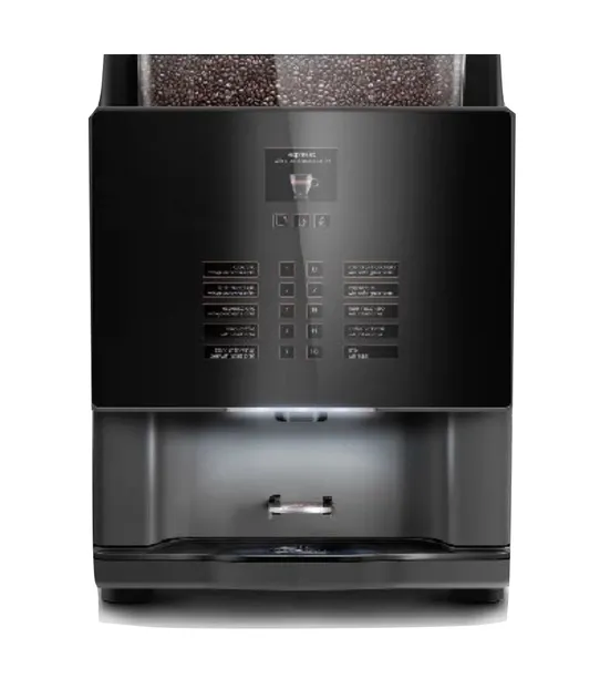 Inteiramente fabricada na Itália Grão + 3 ou + 4 solúveis + 1 saída de água quente direto da caldeira 10 seleções totalmente programáveis + 3 botões para pré-seleção, totalmente programáveis. Novo moinho de laminas cônicas. Sistema de solúveis Rhea: 15.000 RMP os mais potentes do mercado.